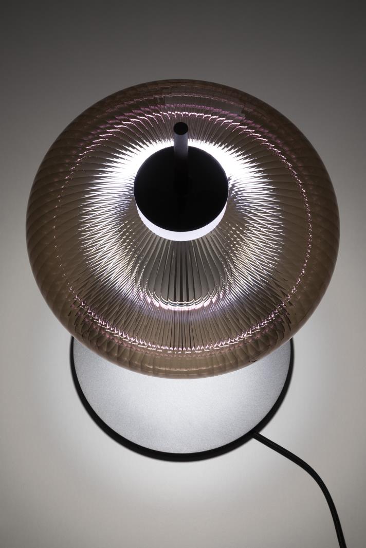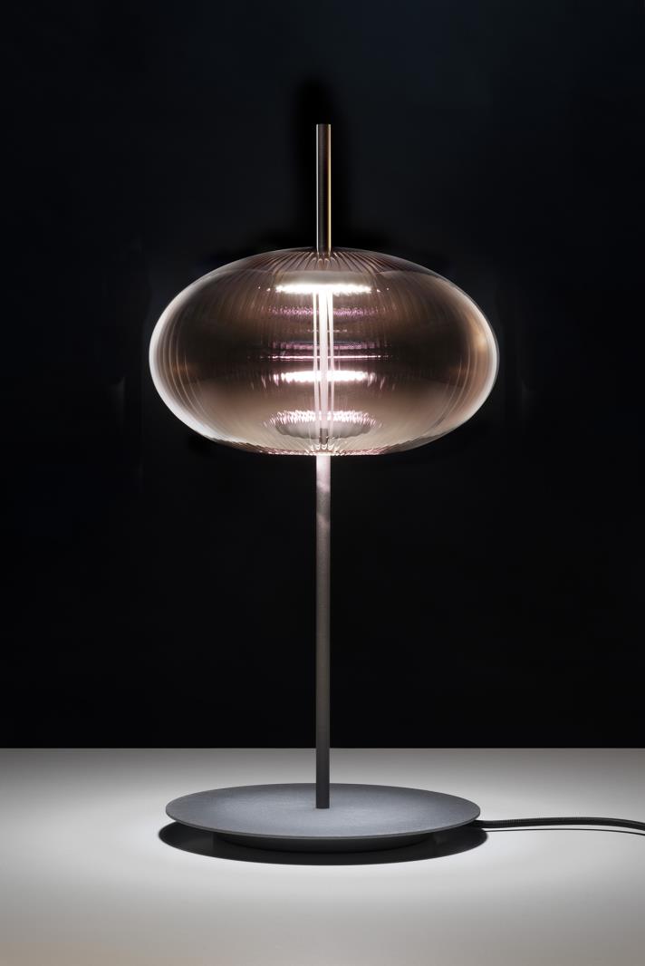 Handcrafted glass table lamp features an amethyst-colored finish that makes it original and extremely refined.