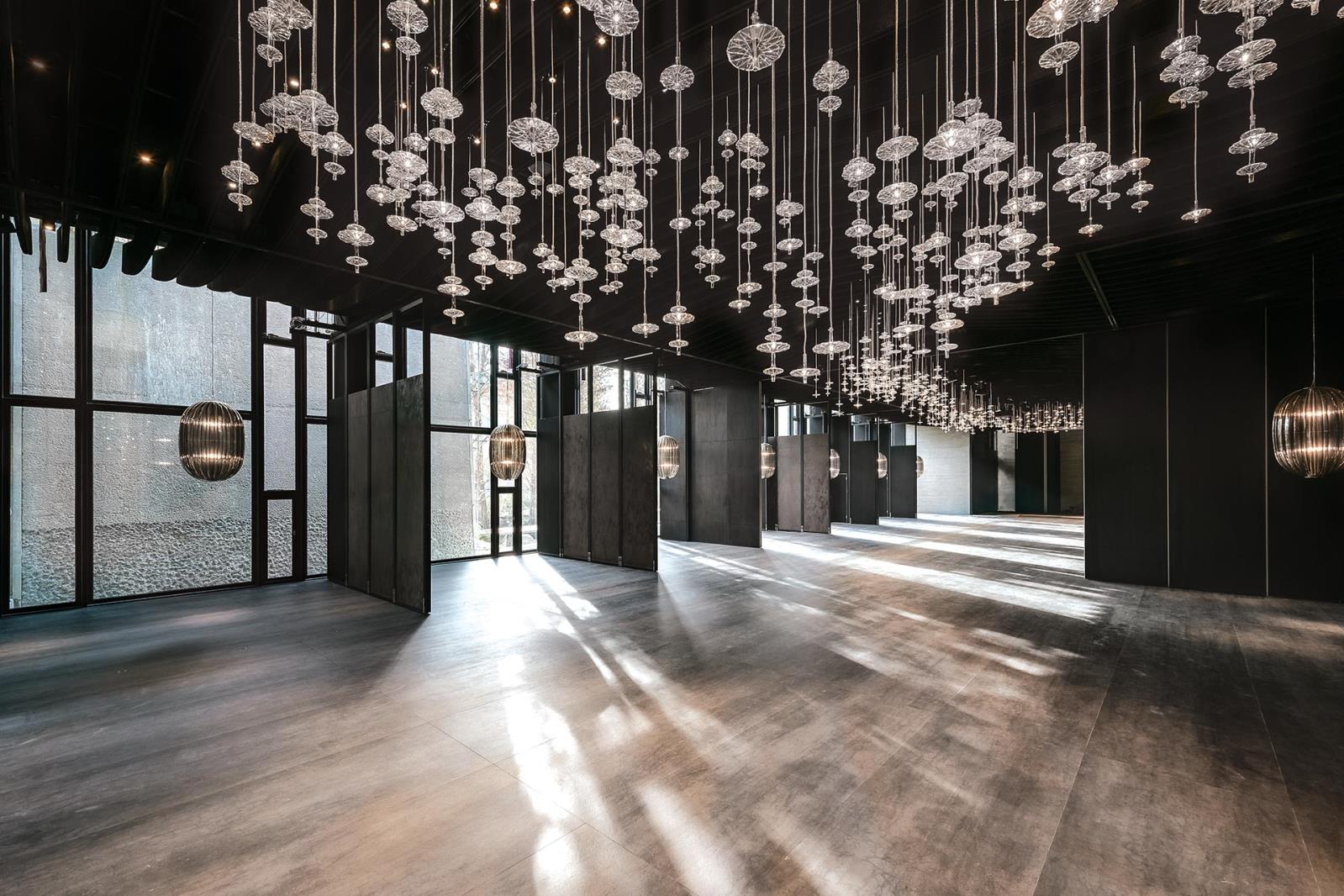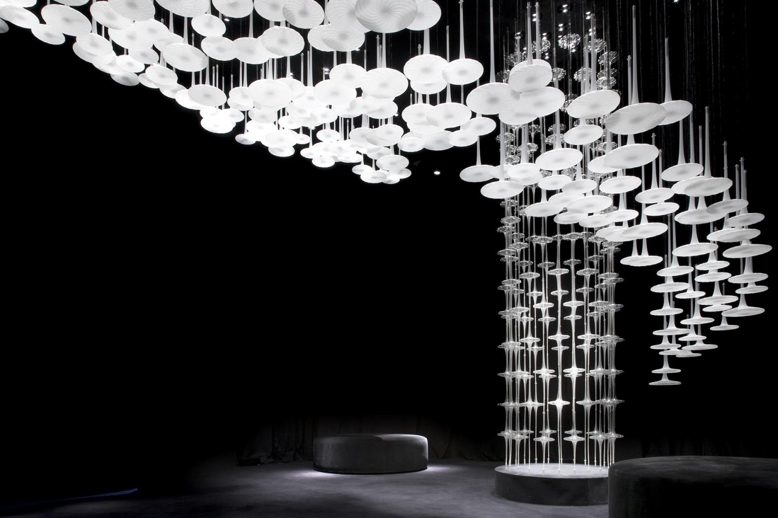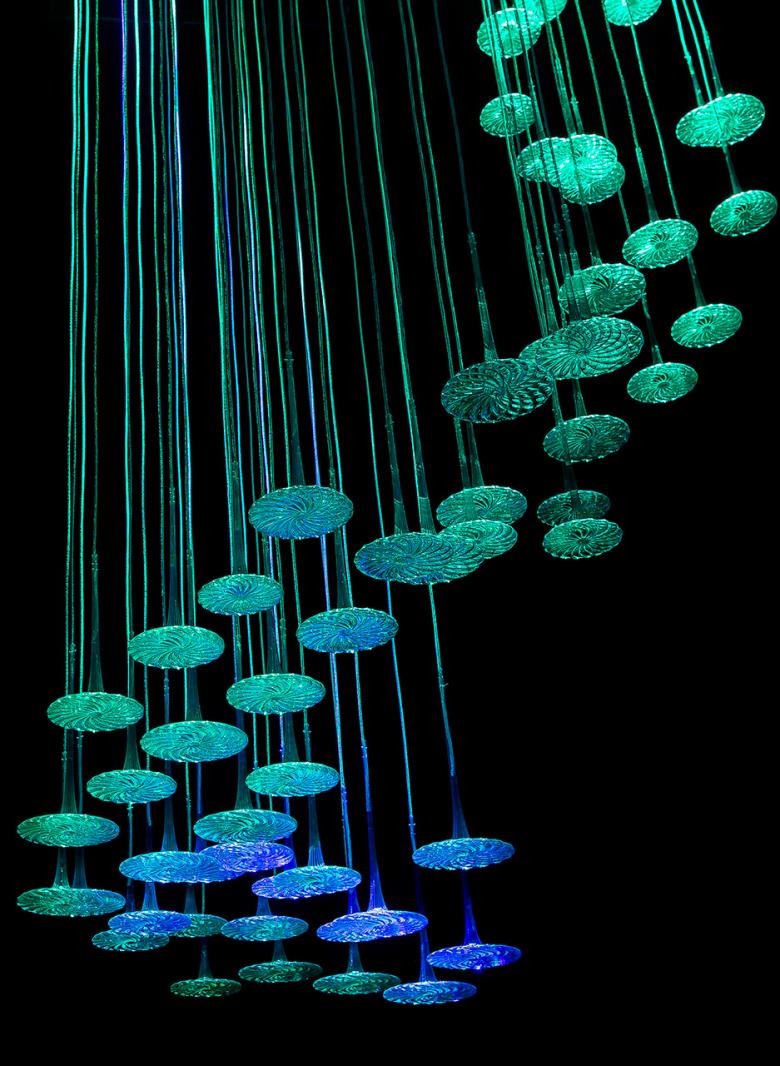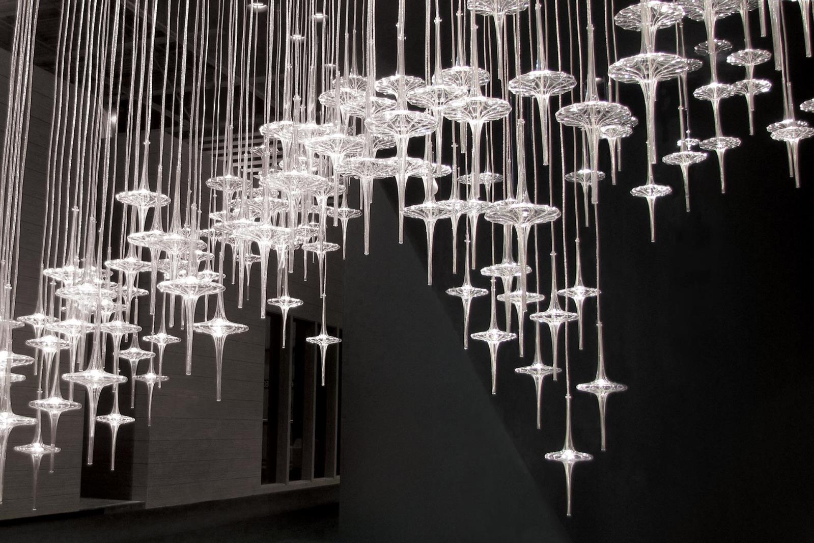 Blown glass shapes, clear or frosted, suspended by tubular colored metal meshes, reflect light in the room, creating suggestive scenographies.