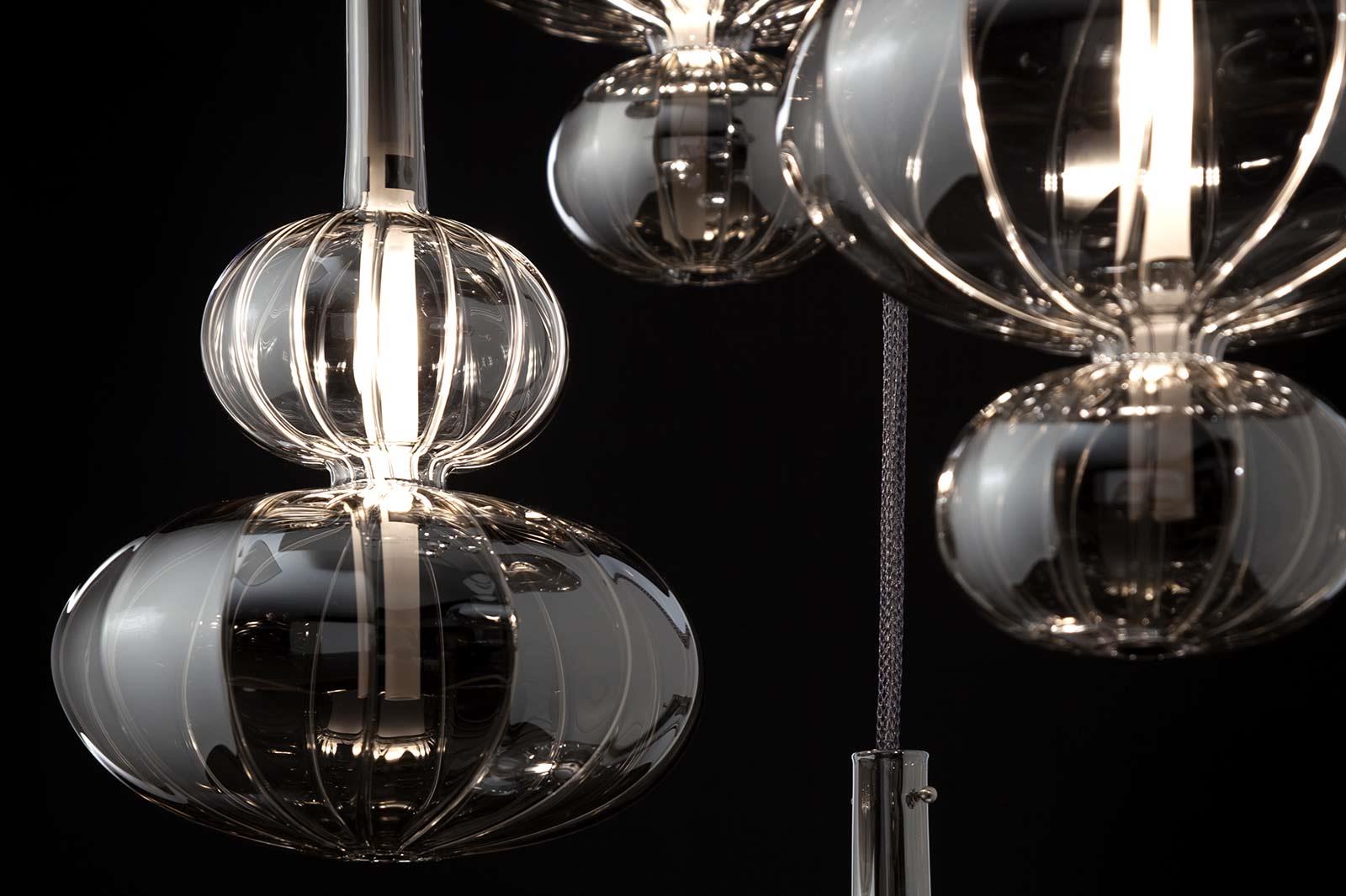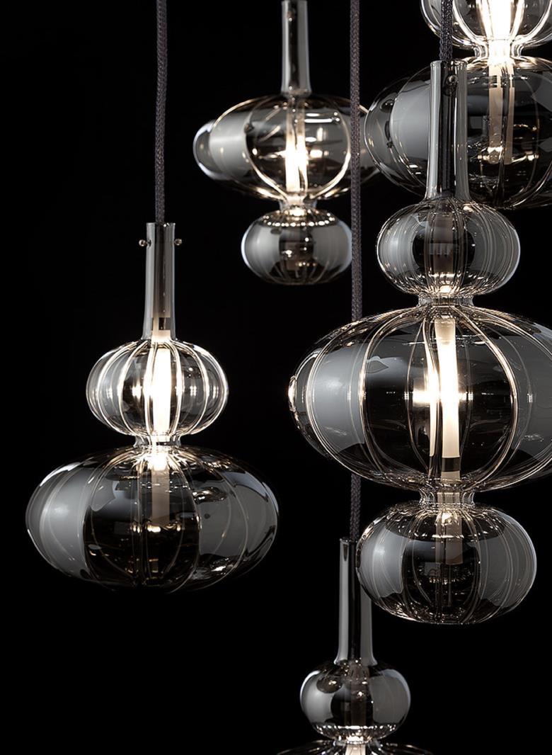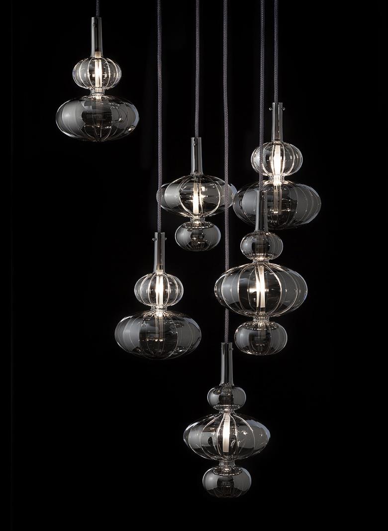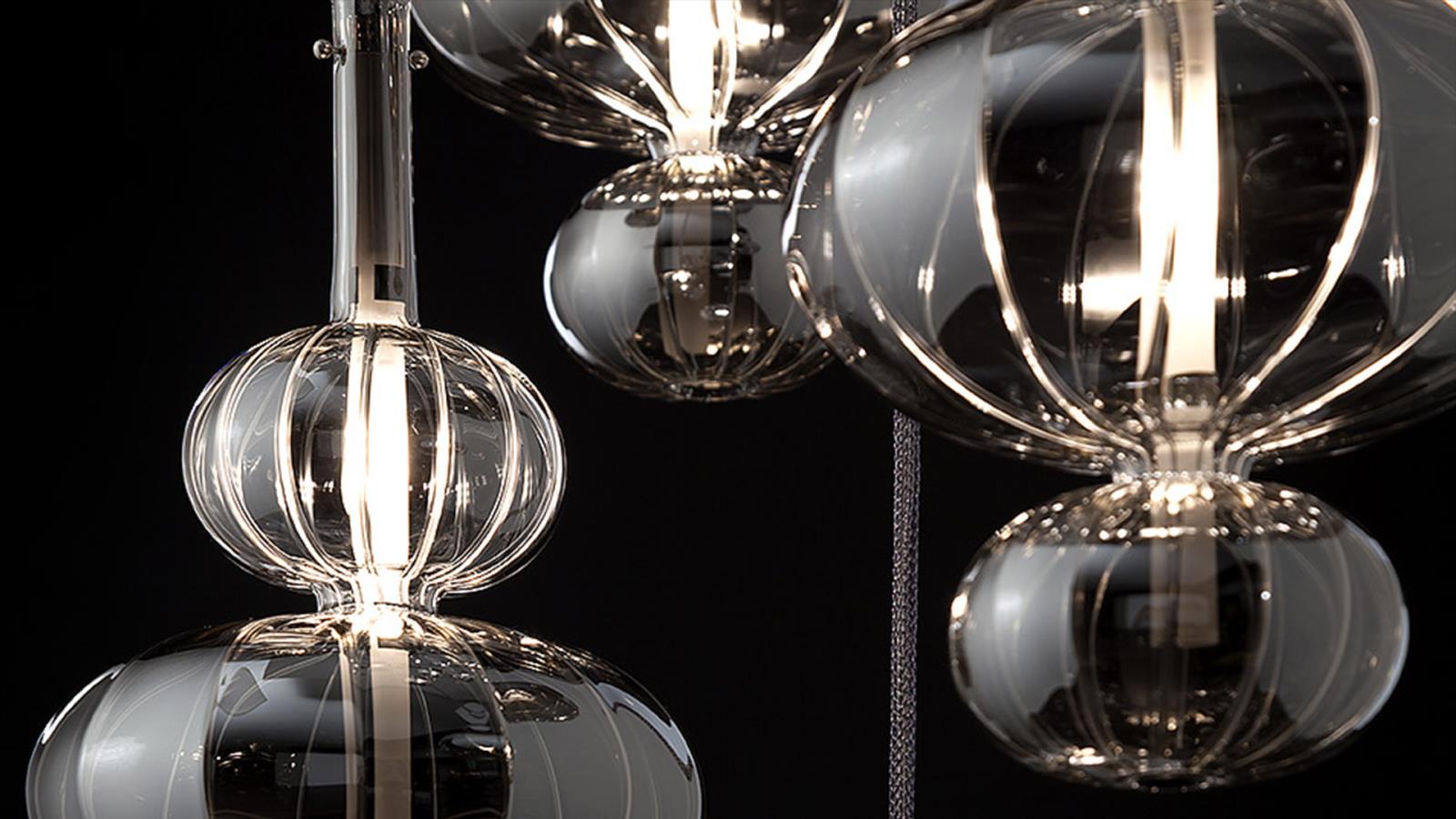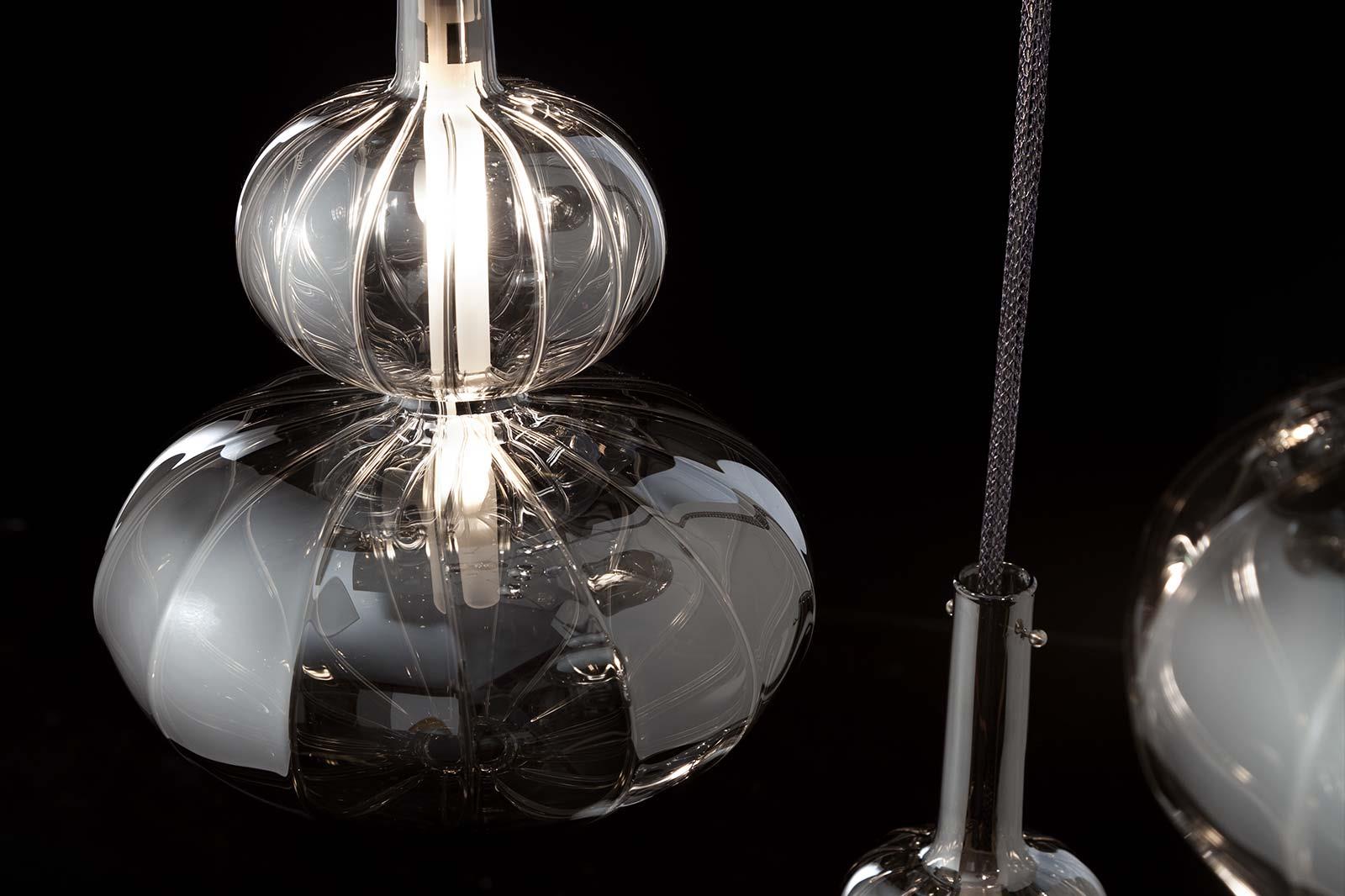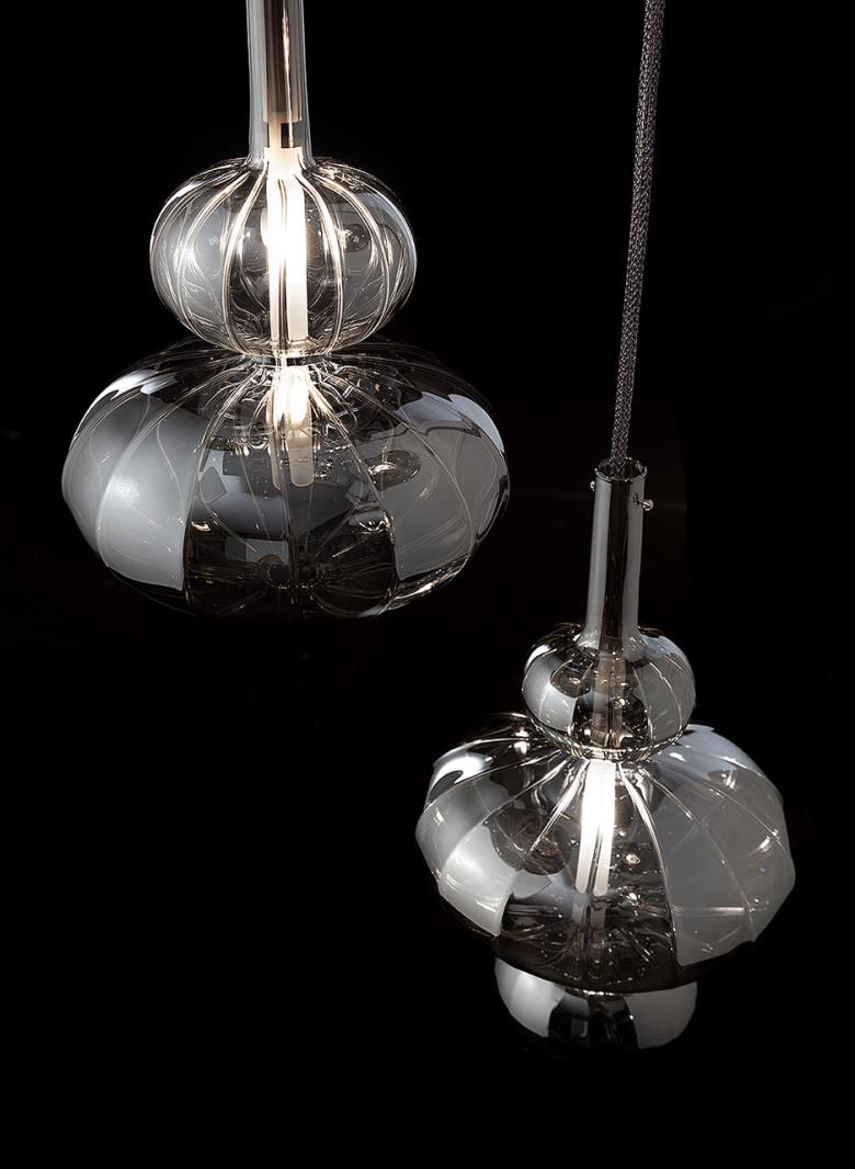 Clear, frosted or titanium metallized ruled blown glass pendant.
