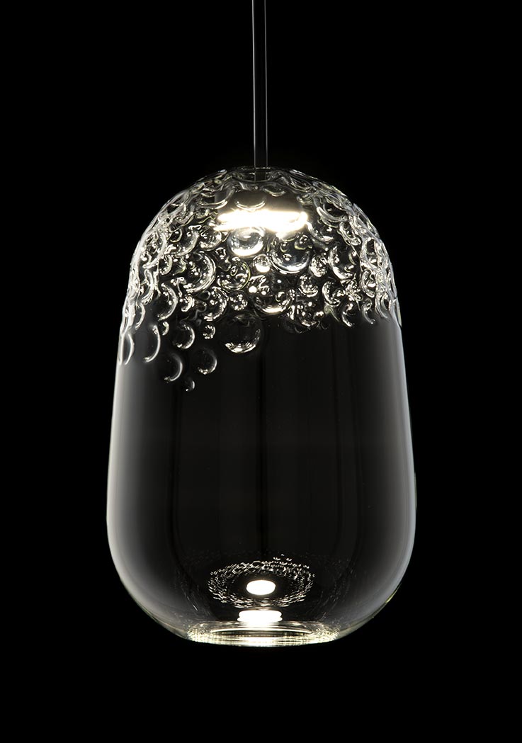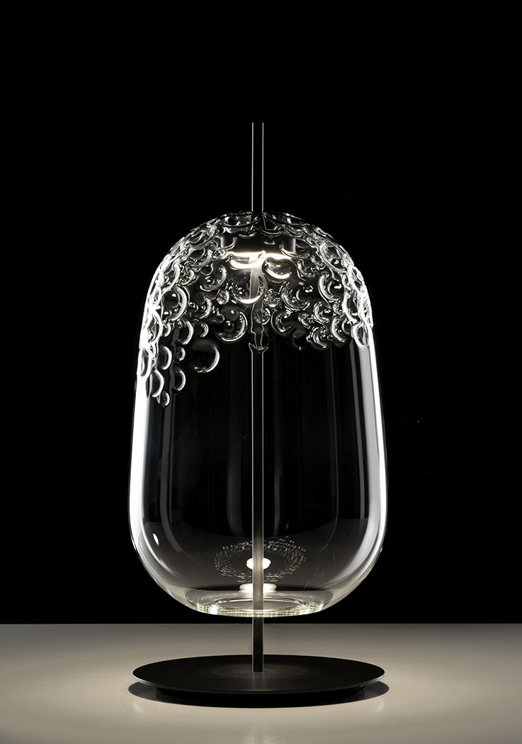 Suspension and table lamp in clear blown glass with opaque anthracite painted metal frame. The precious handwork made it possible to obtain an irregular texture that recalls the manufacturing of shark tanned leather, also called "galuchat" from the name of its first user, Jean-Claude Galuchat, French craftsman at the service of King Louis XV.