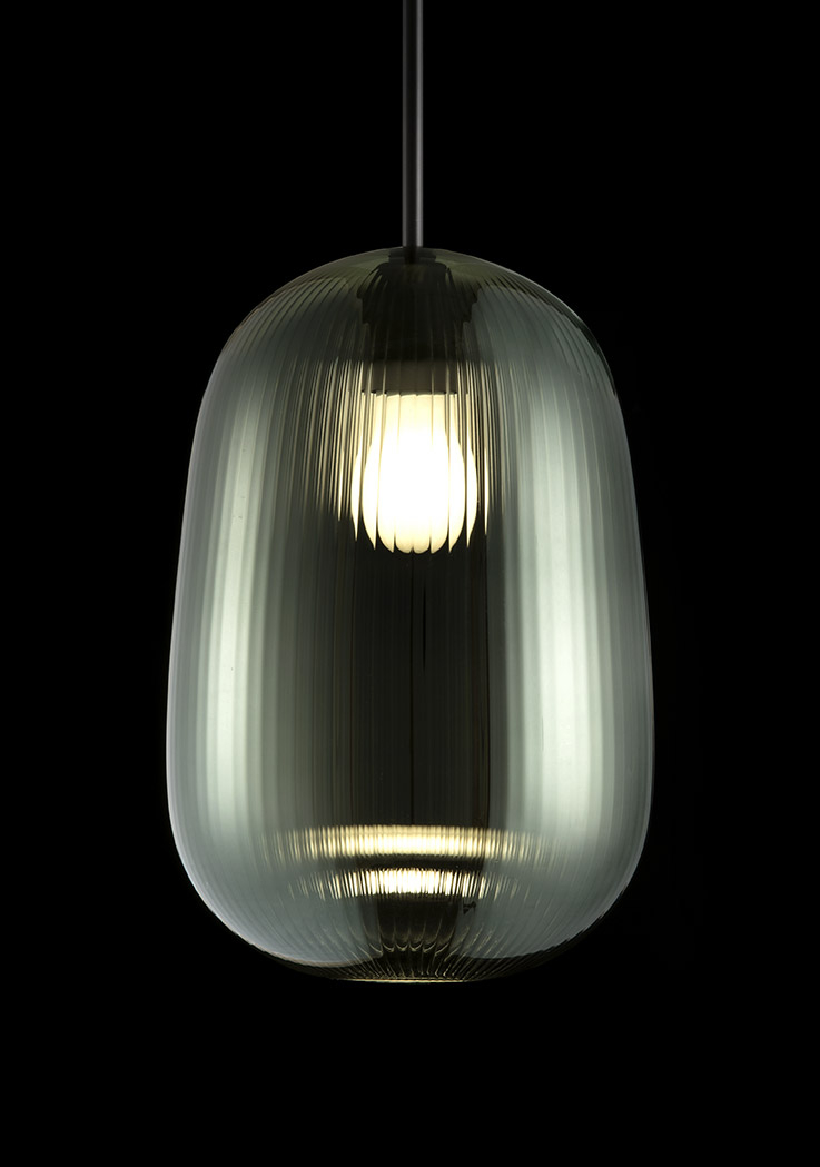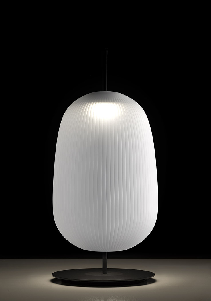 Suspension and table lamp bearing the name of an ancient divinity, made of emerald-colored blown glass characterized by thin lines that create a pleated effect. Also available in white frosted version.