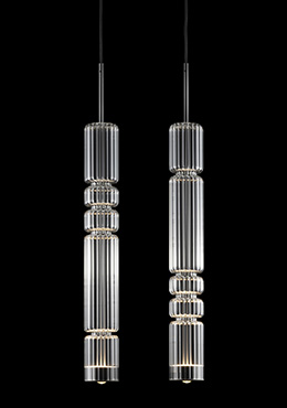 Blown glass, dual-emission pendant lamps designed to emit light in two directions. Calamus, inspired by an ancient writing instrument comes in two versions: 100 and 136.