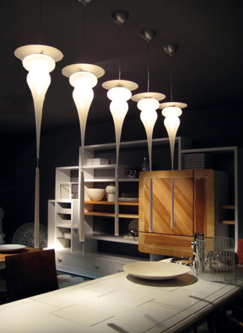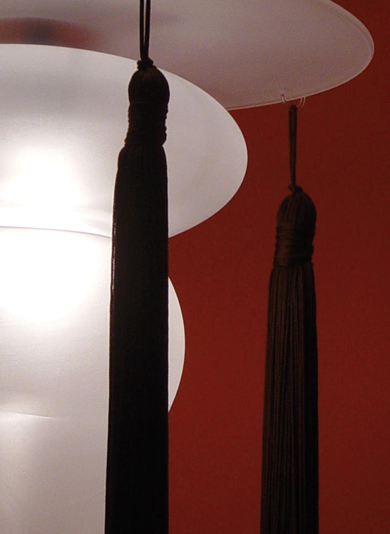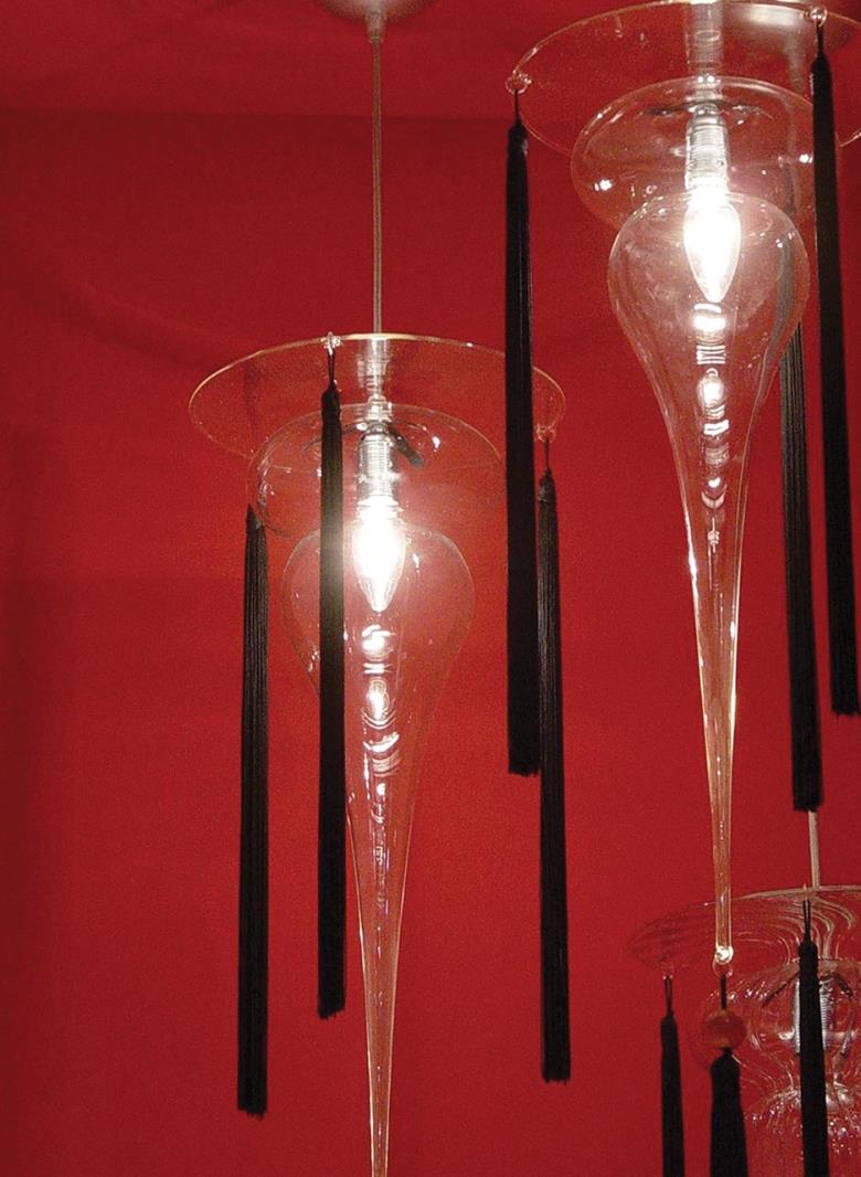 Suspension lamp in clear or frosted hand blown glass with 40 cm long tassel included. Also available with wall support.