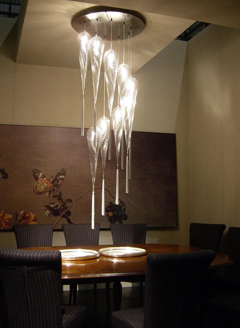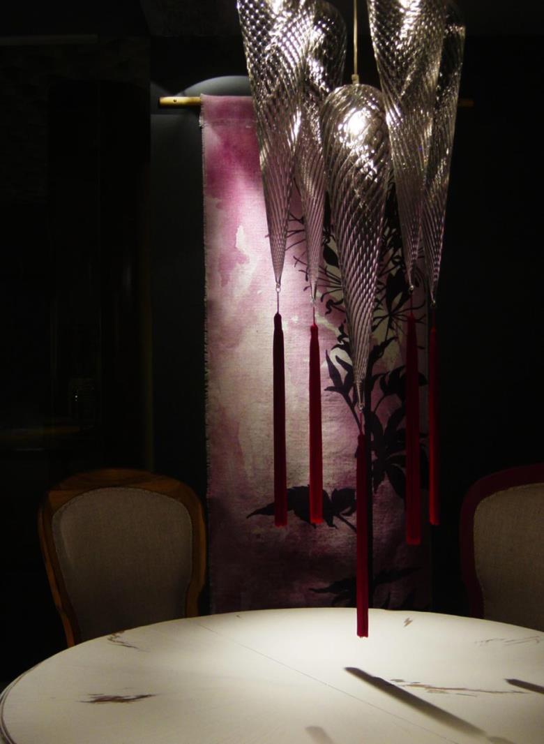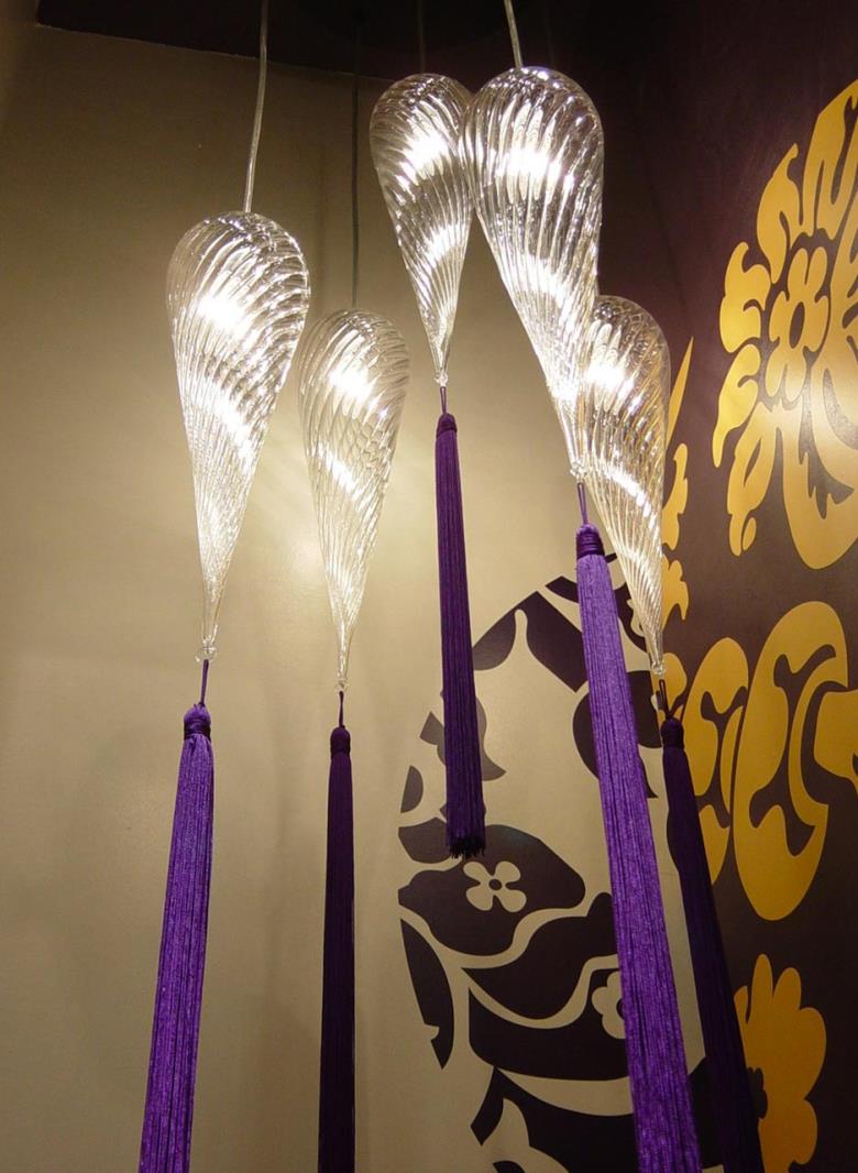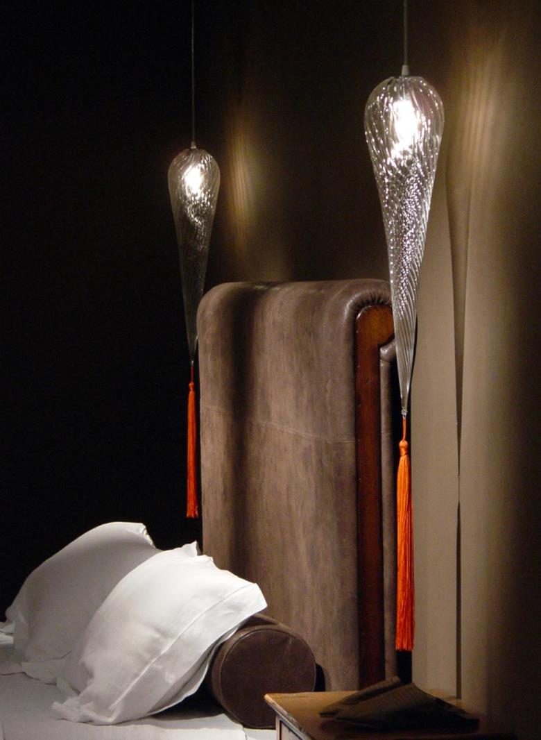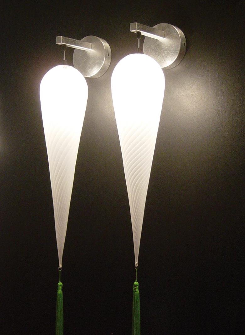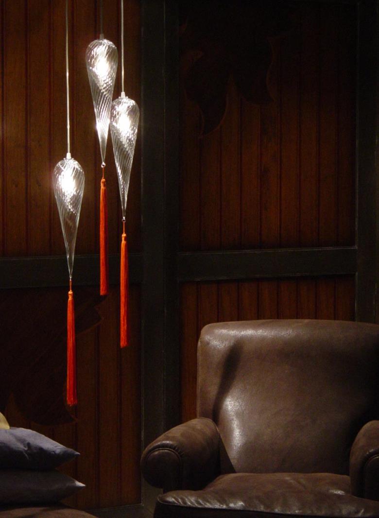 Suspension lamp in hand blown striped glass, clear or frosted, with 40 cm long tassel included. Also available with wall support.