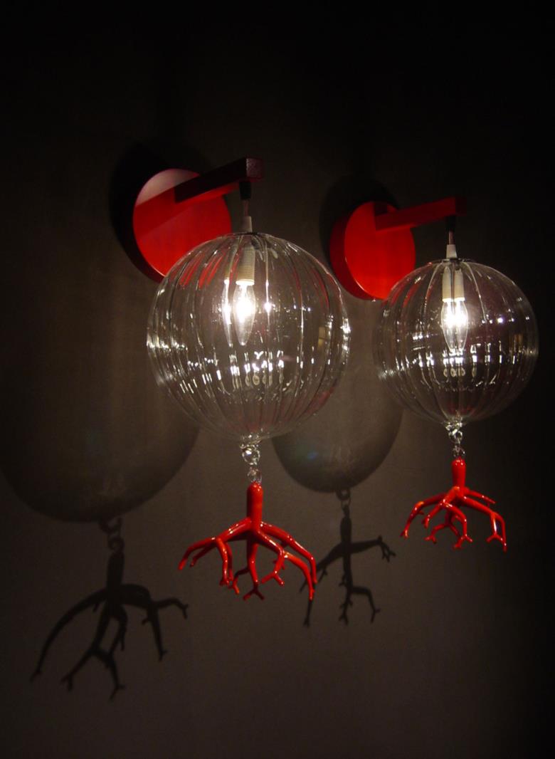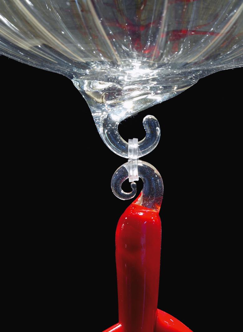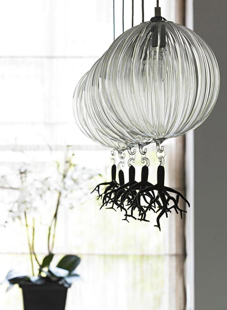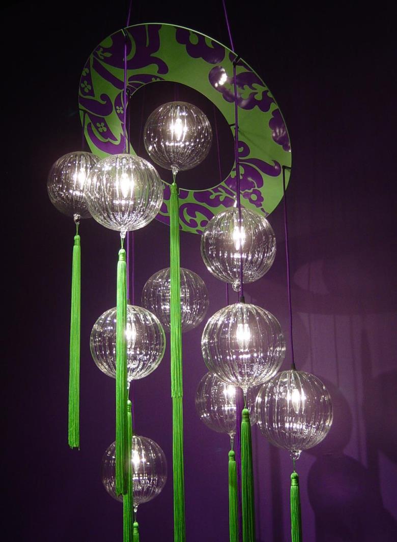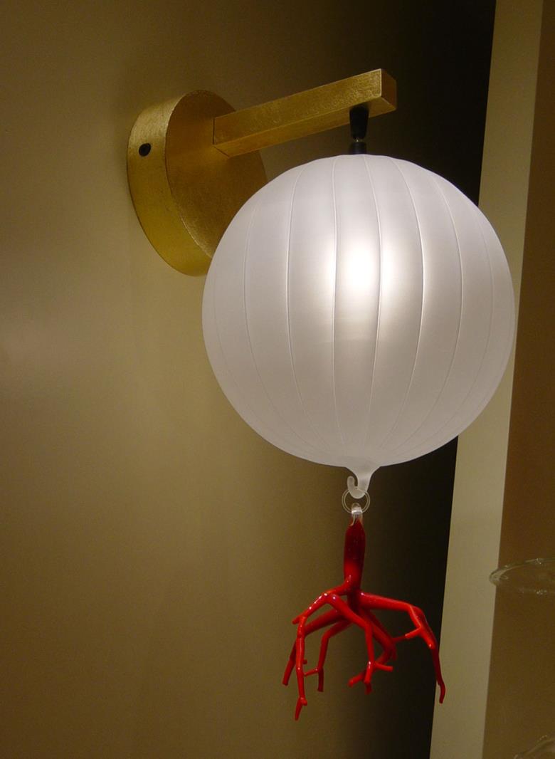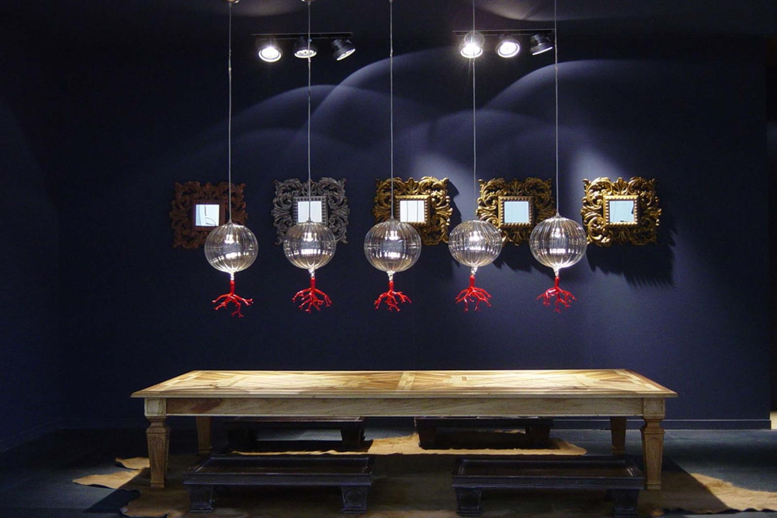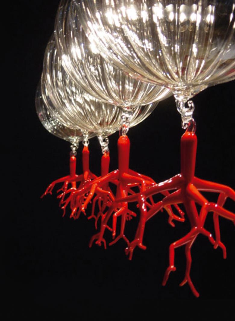 Suspension lamp in hand blown striped glass, clear or frosted, with 40 cm long tassel included.Also available with wall support. Can be combined with “coral” glass pendants.