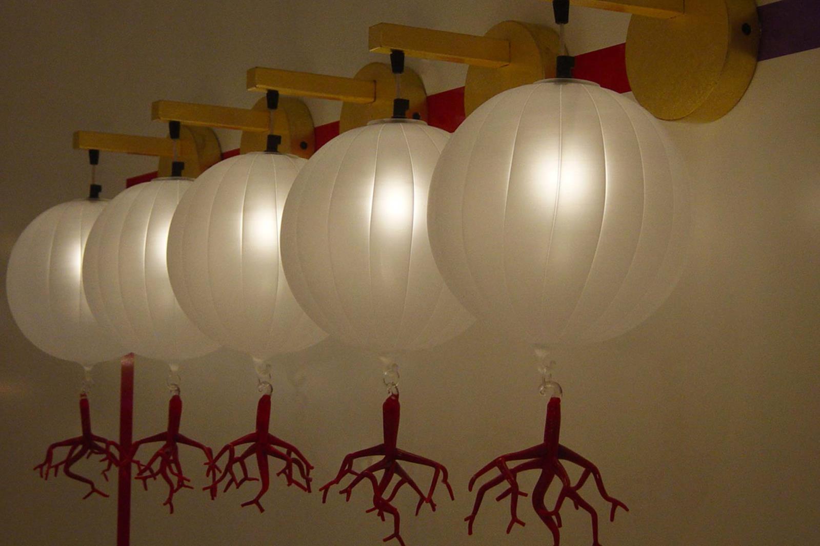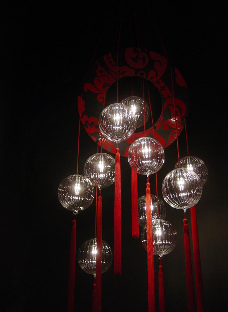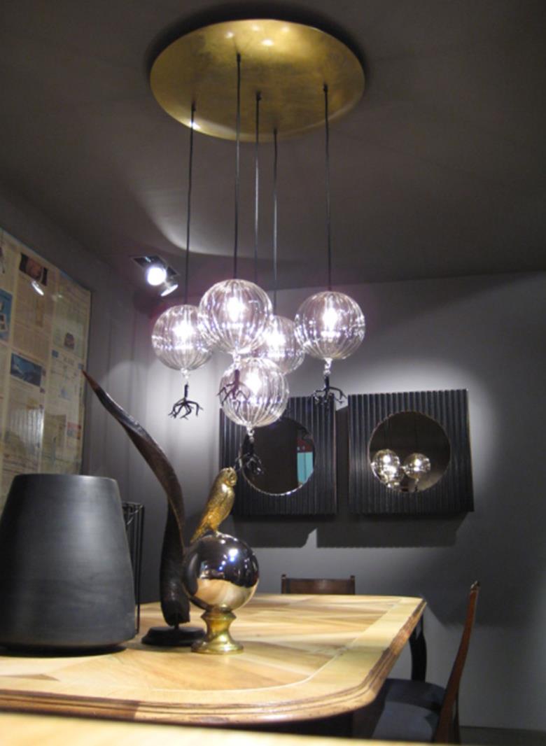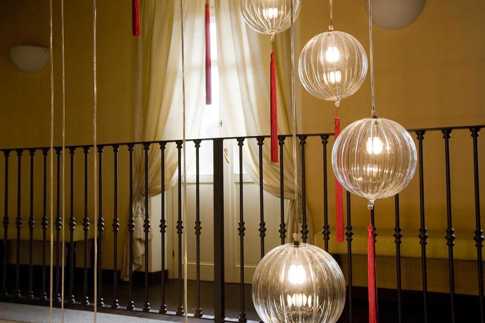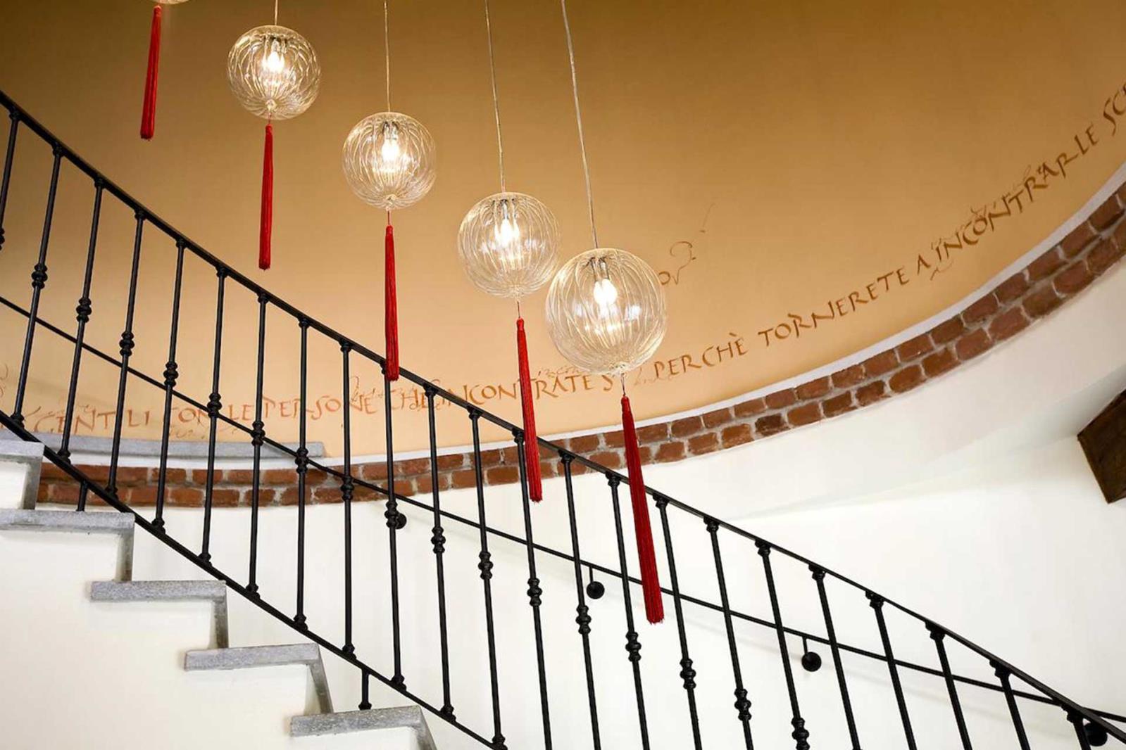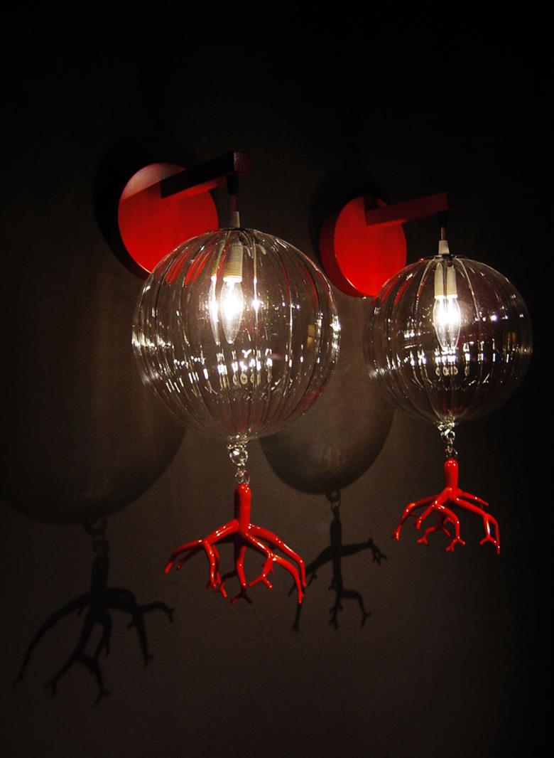 Suspension lamp in hand blown striped glass, clear or frosted, with 40 cm long tassel included.Also available with wall support. Can be combined with “coral” glass pendants.