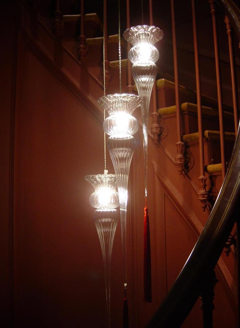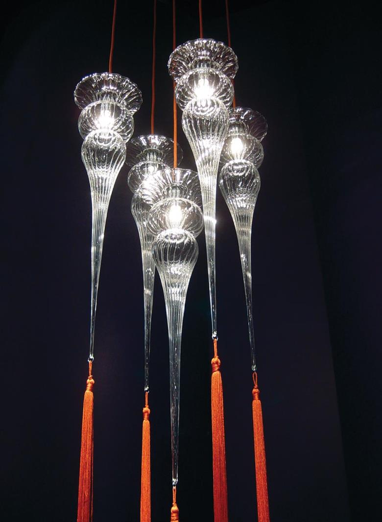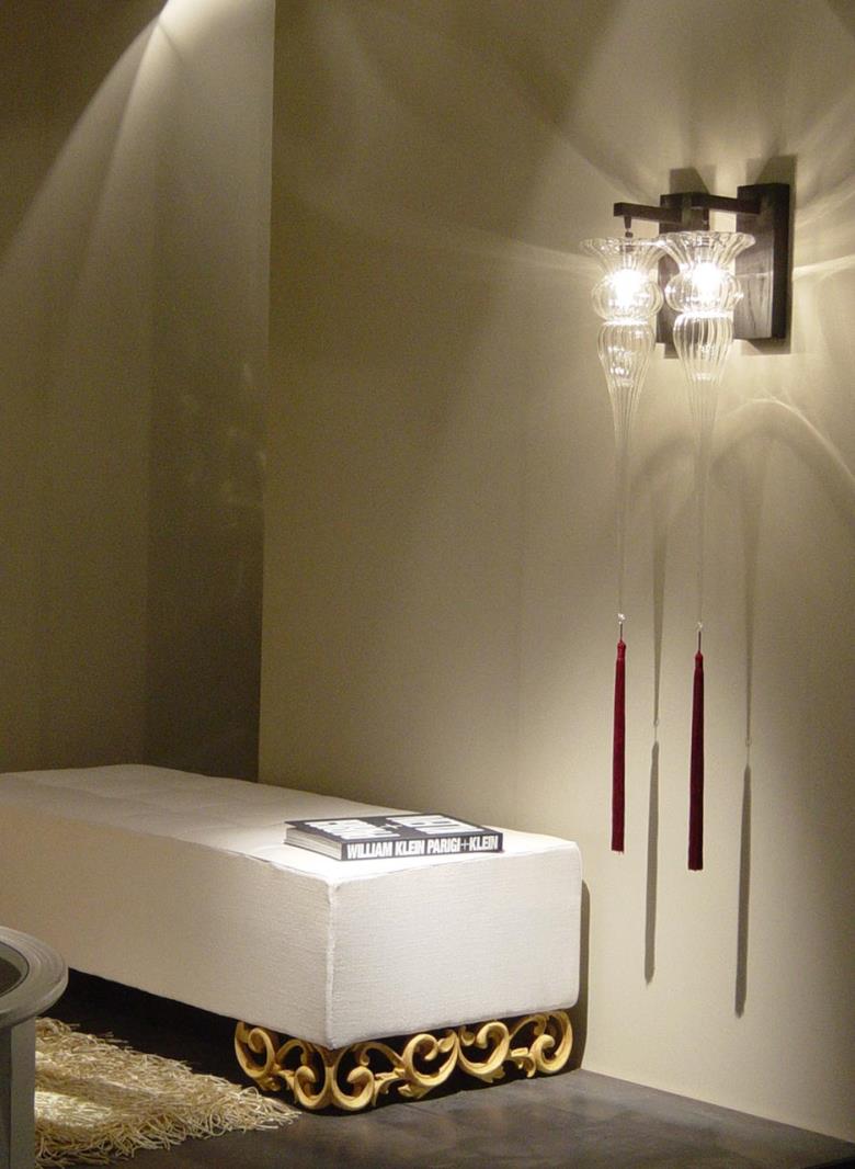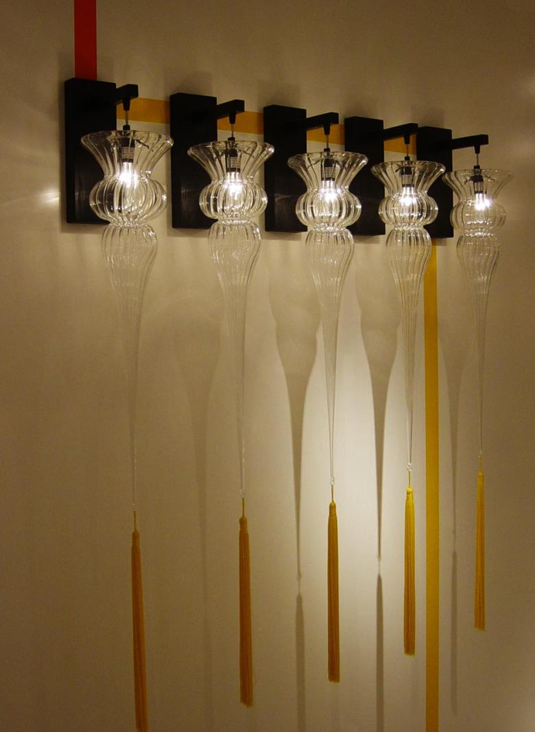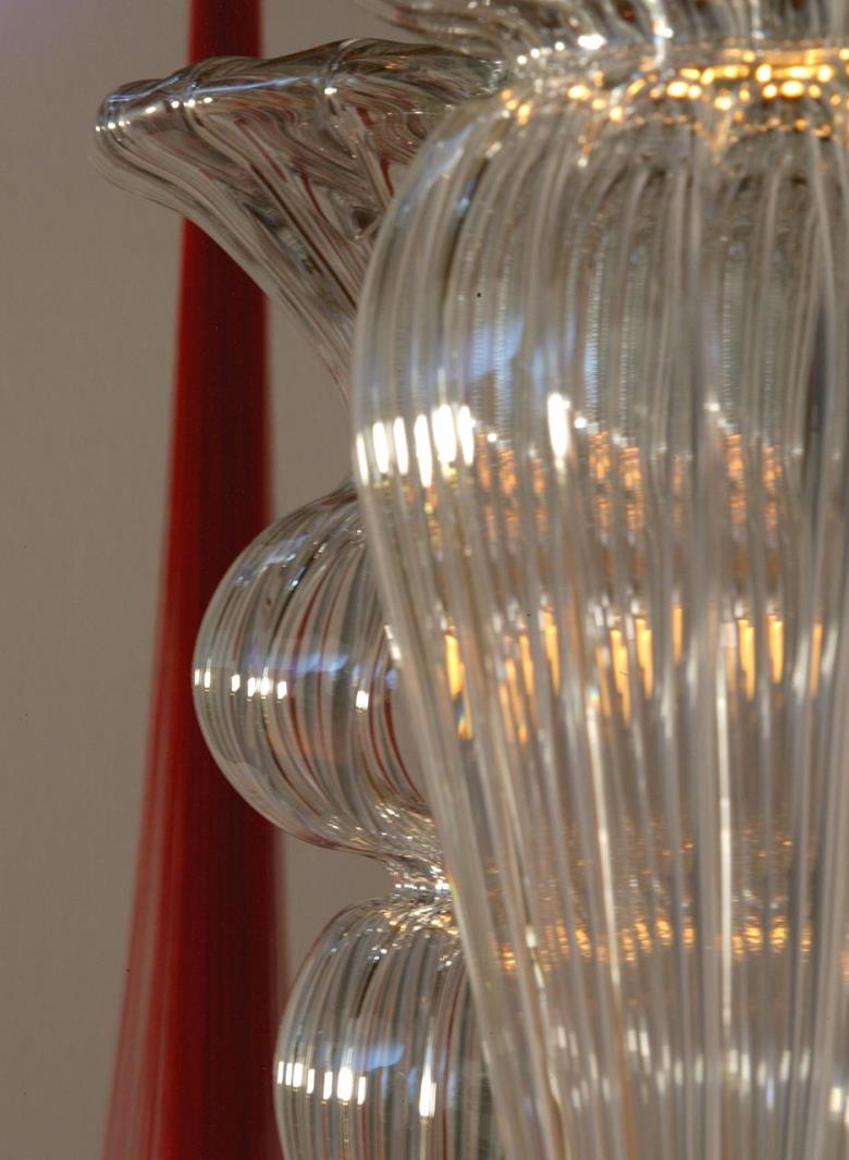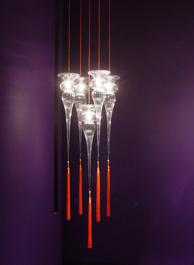 Suspension lamp in hand blown striped glass, clear or frosted, with 40 cm long tassel included. Also available with wall support.