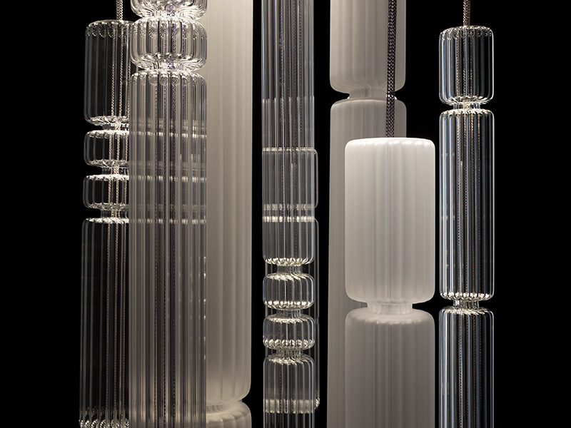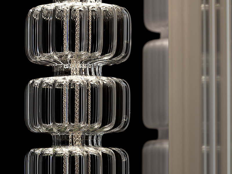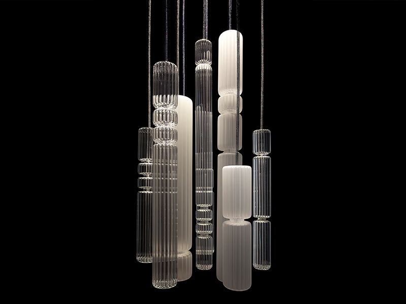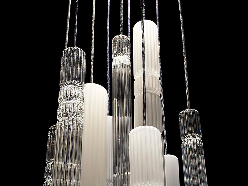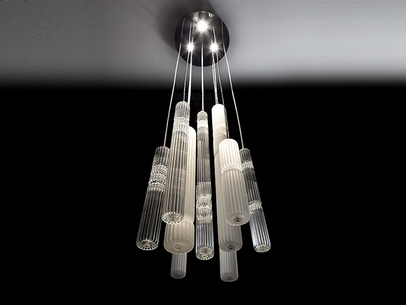 Suspension lamp. Chandelier in clear and frosted ruled blown glass.